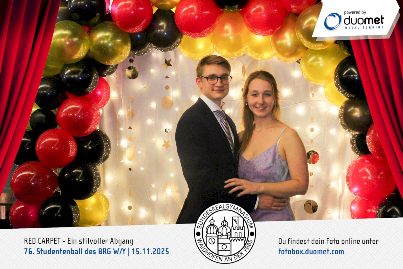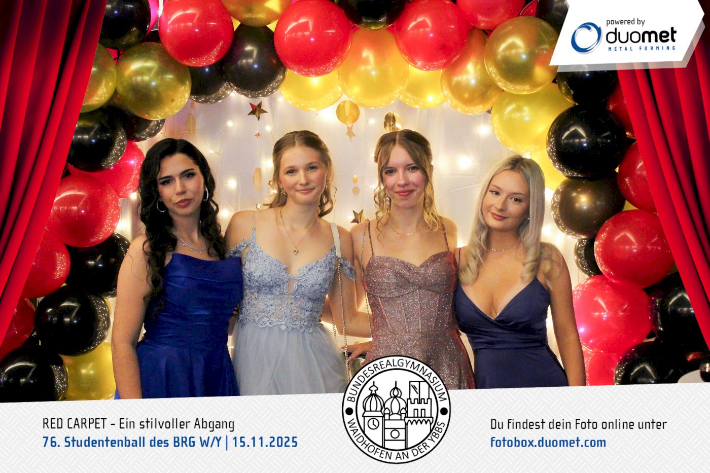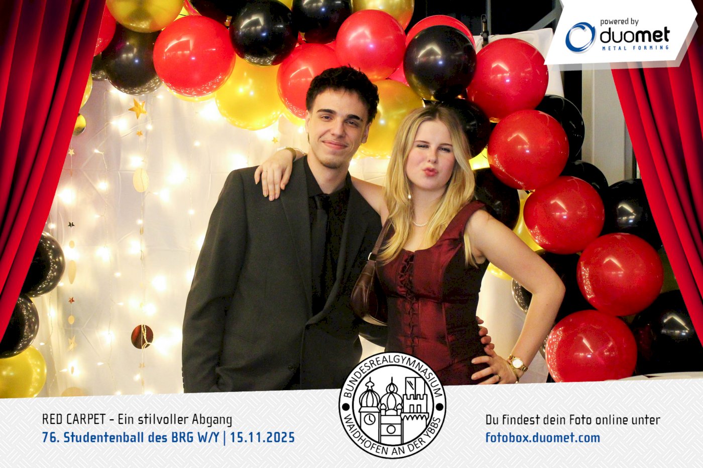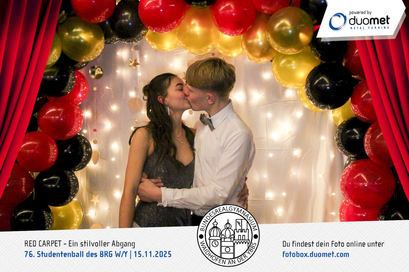 Glanz, Glamour und ganz viel Hollywood-Feeling! Beim Maturaball des BRG Waidhofen/Ybbs am 15. November verwandelte sich das Schloss an der Eisenstraße unter dem Motto „Red Carpet – ein stilvoller Abgang“ in ein Filmset voller strahlender Auftritte. Zwischen Polonaise und Mitternachtseinlage war für viele ein Fixpunkt klar: ein Erinnerungsfoto an unserer Fotobox – Star-Vibes und Paparazzi-Feeling inklusive.