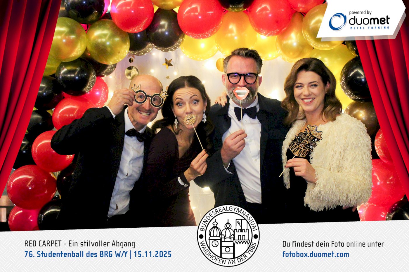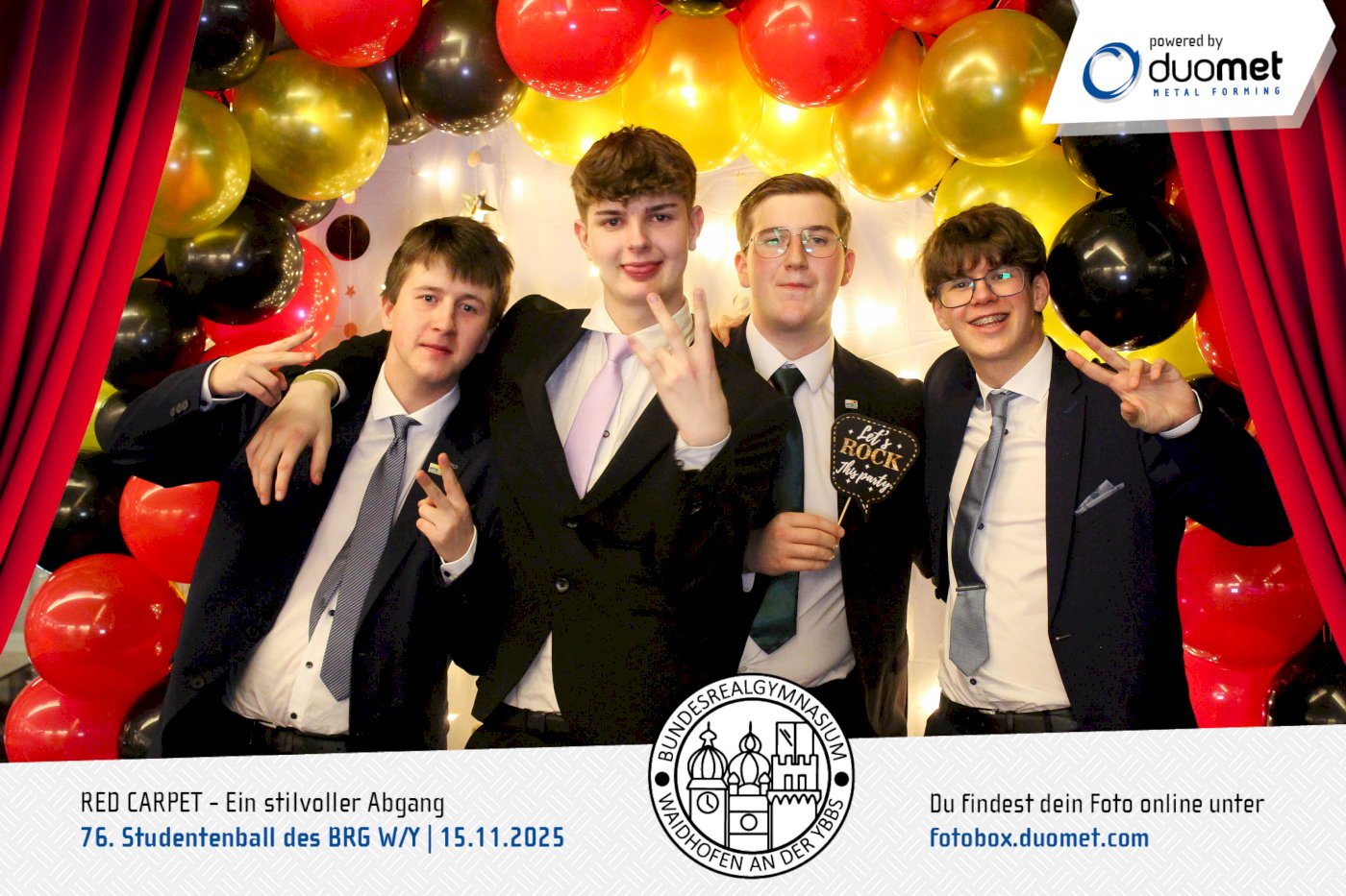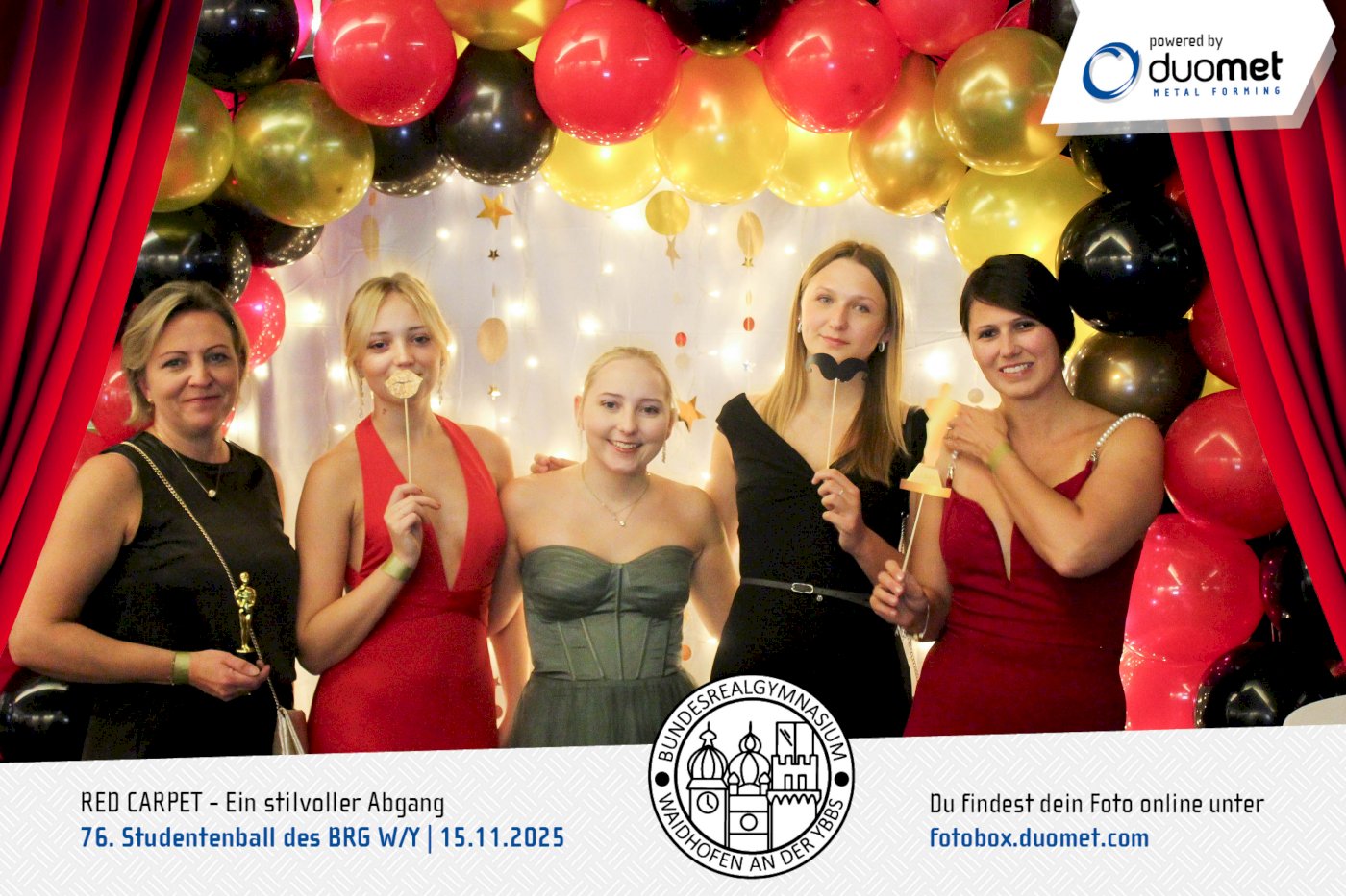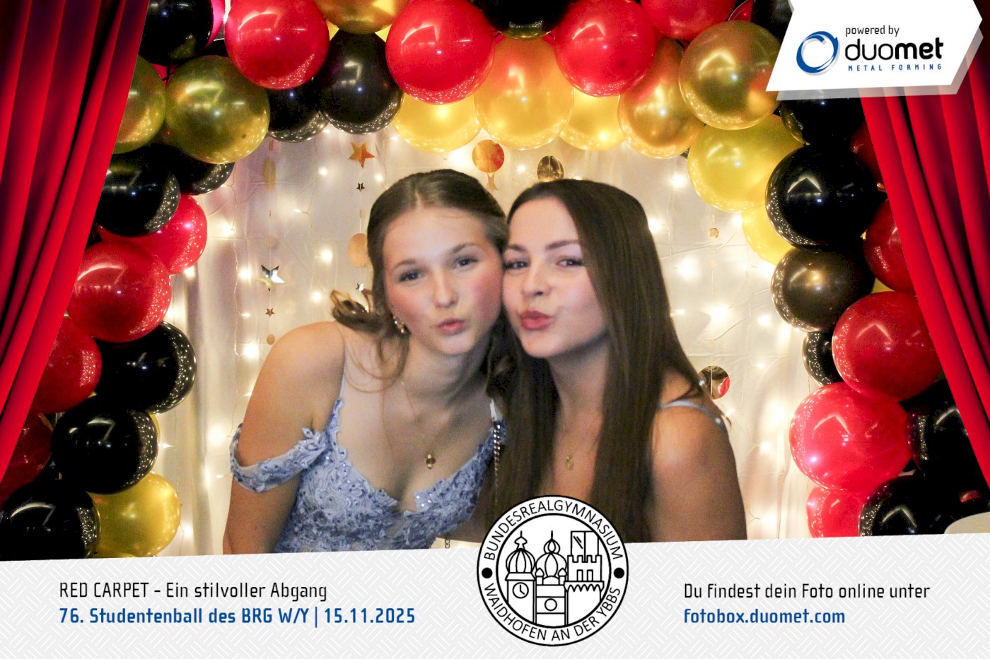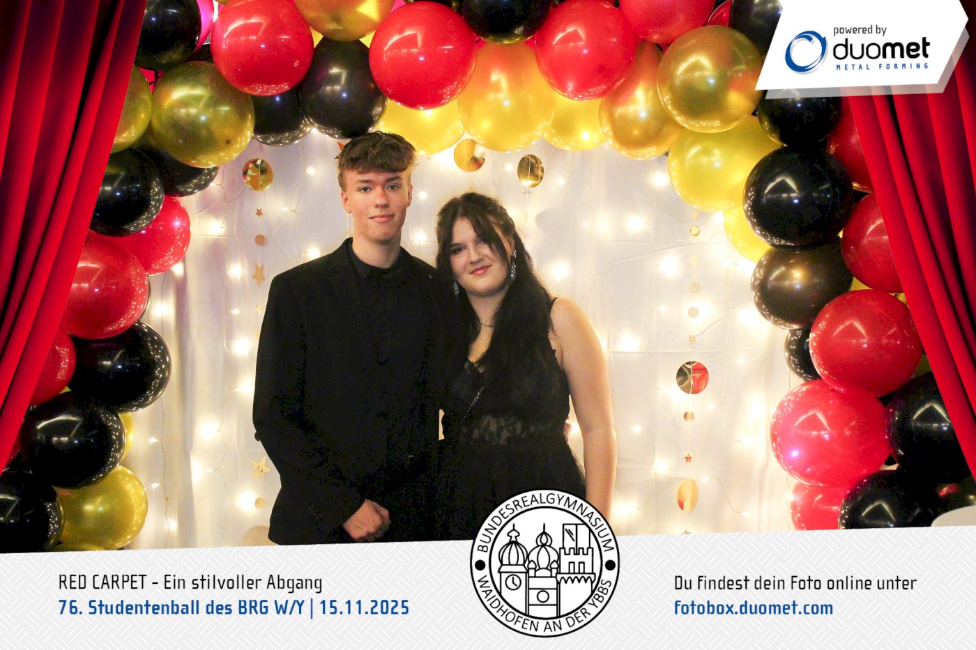 Glanz, Glamour und ganz viel Hollywood-Feeling! Beim Maturaball des BRG Waidhofen/Ybbs am 15. November verwandelte sich das Schloss an der Eisenstraße unter dem Motto „Red Carpet – ein stilvoller Abgang“ in ein Filmset voller strahlender Auftritte. Zwischen Polonaise und Mitternachtseinlage war für viele ein Fixpunkt klar: ein Erinnerungsfoto an unserer Fotobox – Star-Vibes und Paparazzi-Feeling inklusive.