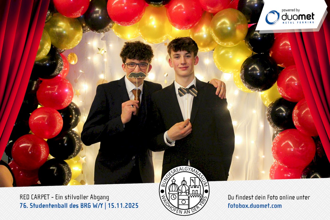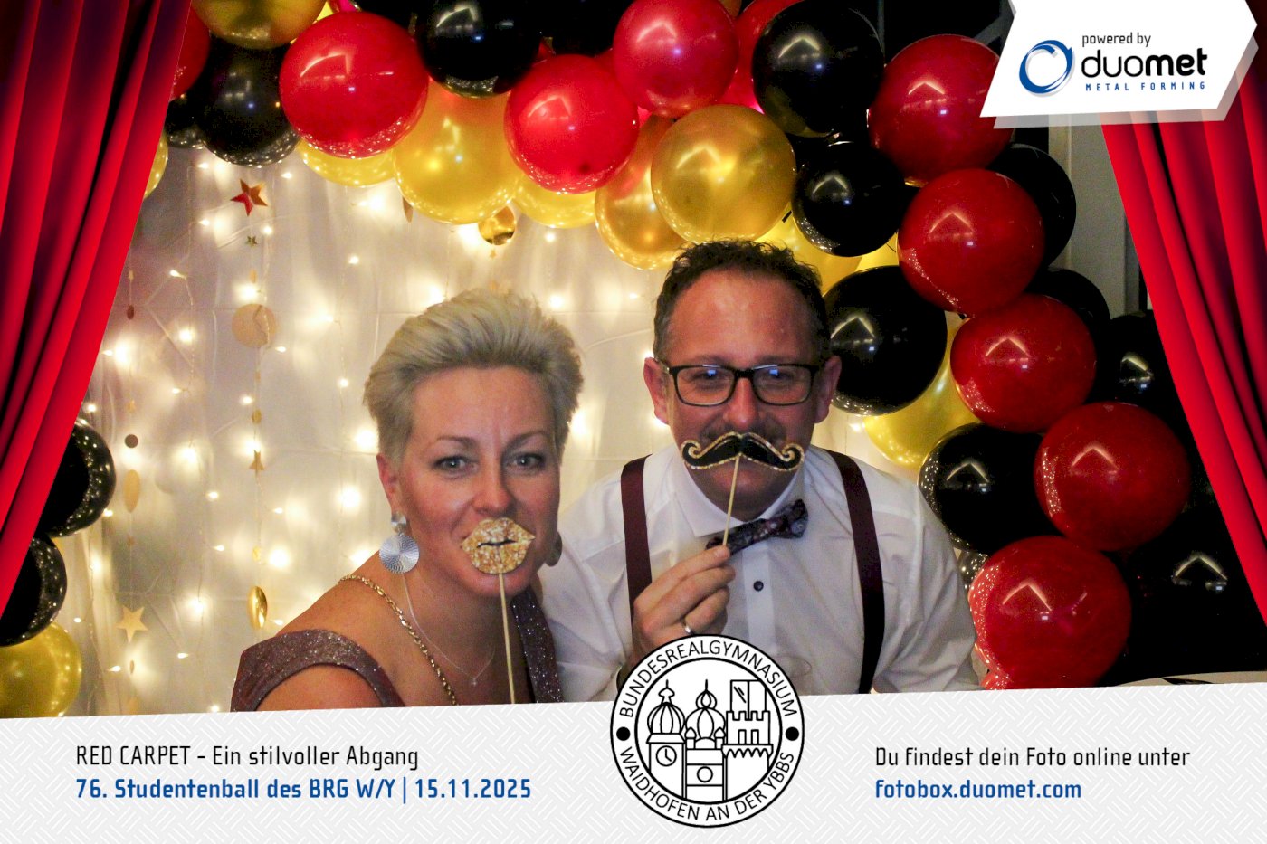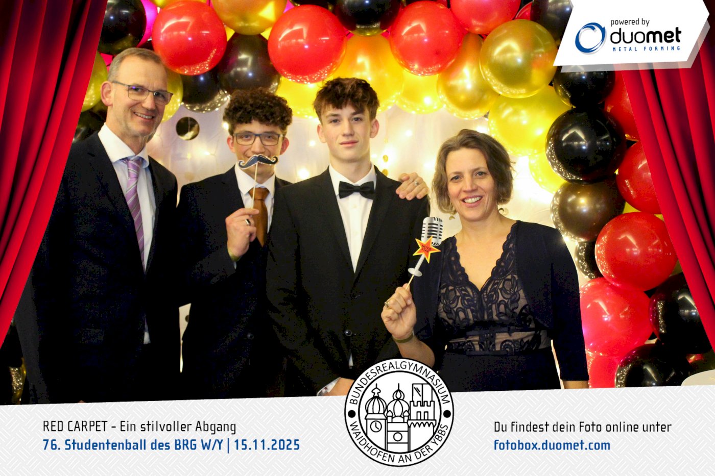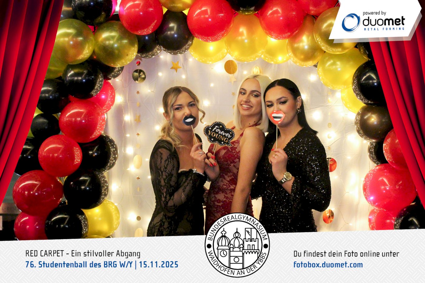 Glanz, Glamour und ganz viel Hollywood-Feeling! Beim Maturaball des BRG Waidhofen/Ybbs am 15. November verwandelte sich das Schloss an der Eisenstraße unter dem Motto „Red Carpet – ein stilvoller Abgang“ in ein Filmset voller strahlender Auftritte. Zwischen Polonaise und Mitternachtseinlage war für viele ein Fixpunkt klar: ein Erinnerungsfoto an unserer Fotobox – Star-Vibes und Paparazzi-Feeling inklusive.